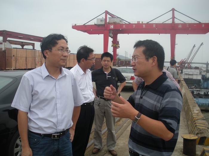 2010年9月8日,湖南省社科院研究員黃海一行在長(zhǎng)沙市口岸辦副主任王光輝的陪同下,來長(zhǎng)沙新港進(jìn)行長(zhǎng)沙水運(yùn)口岸建設(shè)的調(diào)研。