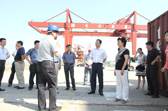 圖為長沙集星集裝箱碼頭有限公司總經(jīng)理助理周勇(前左一)在向長沙市政協(xié)黨組副書記、副主席鐘新蓮(前右一)、長沙市開福區(qū)區(qū)委書記李蔚(前右二)介紹長沙新港目前的集裝箱業(yè)務(wù)情況。 2013年7月11日上午,長沙市政協(xié)黨組副書記、副主席鐘新蓮在長沙市開福區(qū)區(qū)委書記李蔚的陪同下,就現(xiàn)代物流業(yè)發(fā)展情況來長沙新港視察調(diào)研。湖南長沙新港有限責(zé)任公司董事、財(cái)務(wù)總監(jiān)趙赤書,長沙集星集裝箱碼頭有限公司總經(jīng)理助理周勇出席接待。鐘新蓮副主席對港口建設(shè)及港口目前的發(fā)展情況等一系列問題進(jìn)行了深入考察。 |