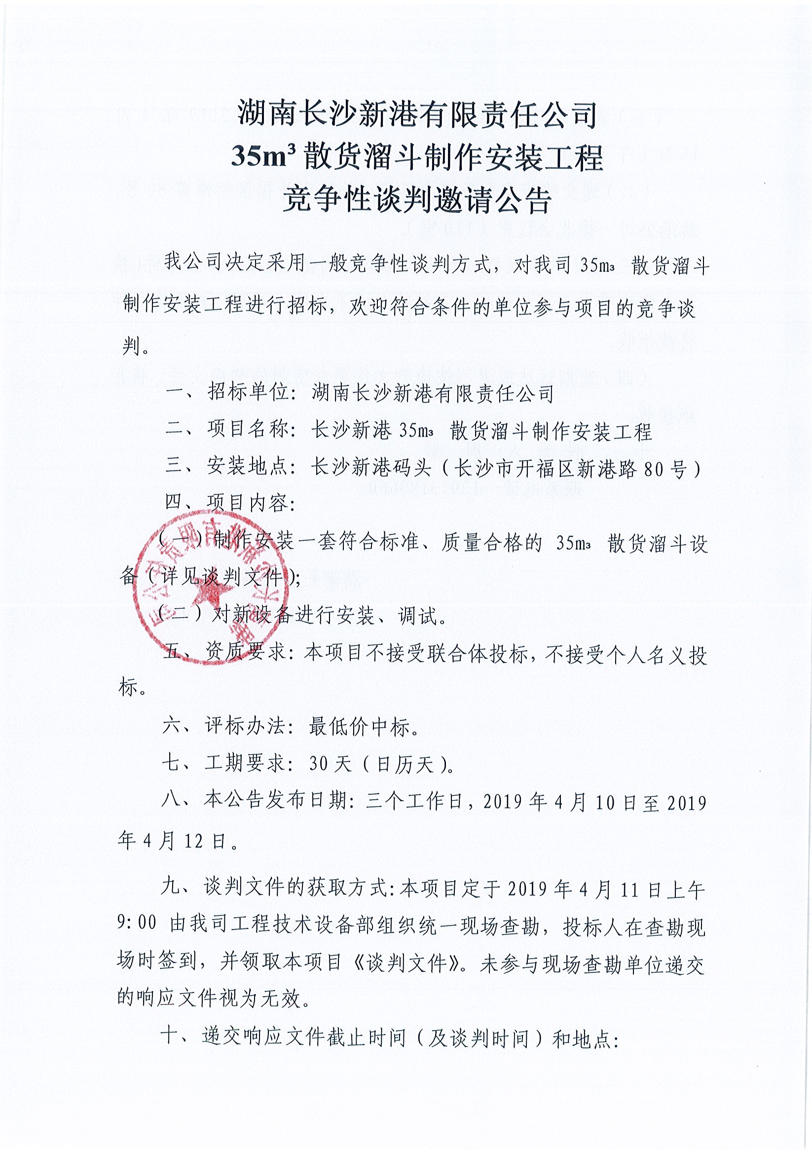 湖南長沙新港有限責(zé)任公司35m³散貨溜斗制作安裝工程競爭性談判邀請(qǐng)公告