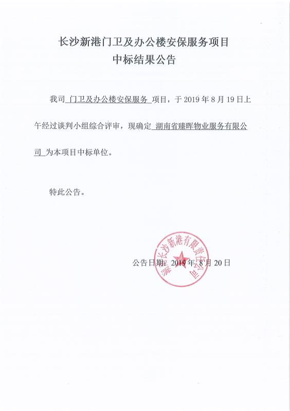 長沙新港門衛(wèi)及辦公樓安保服務(wù)項目中標(biāo)結(jié)果公告