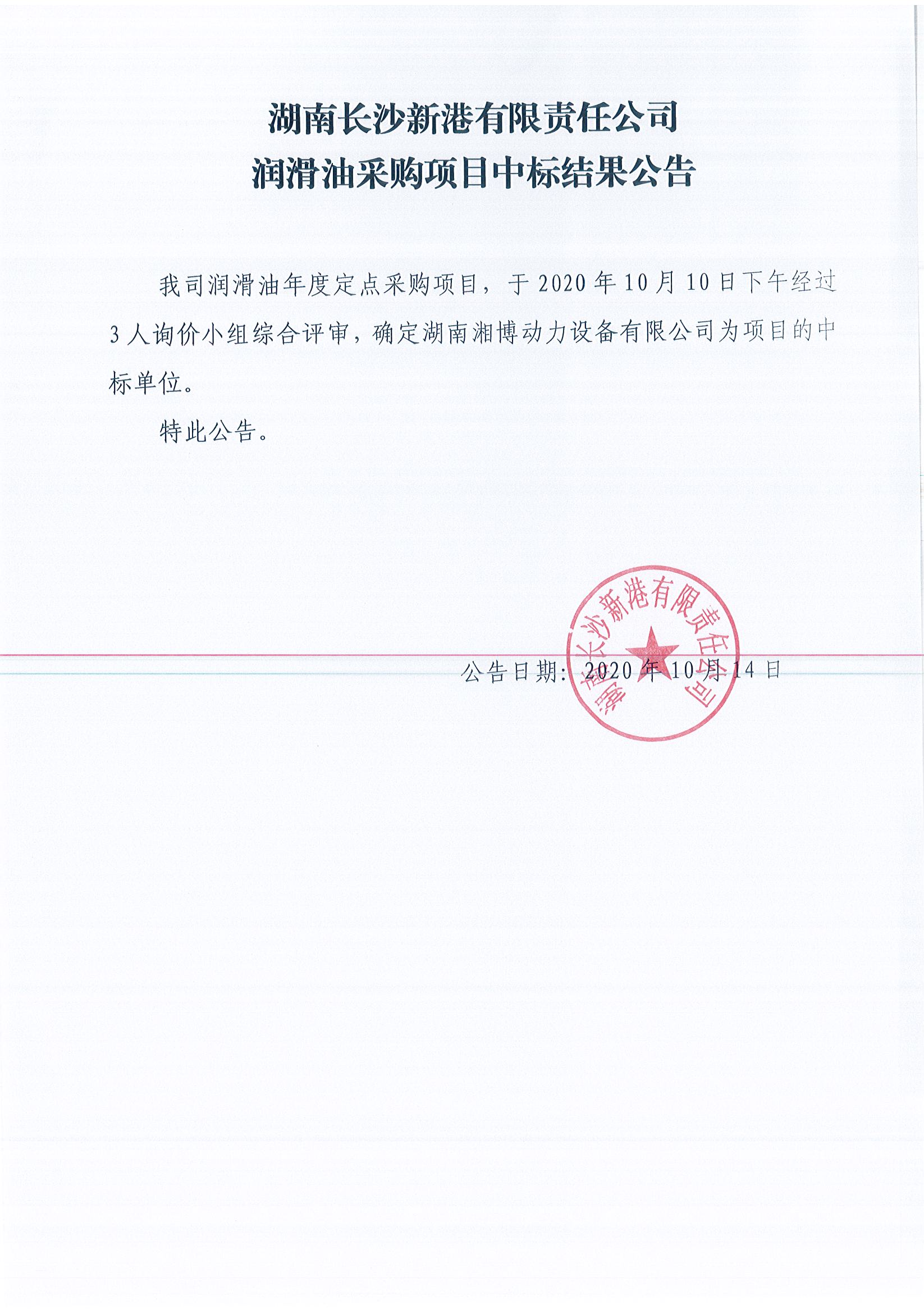湖南長沙新港有限責(zé)任公司潤滑油采購項(xiàng)目中標(biāo)結(jié)果公告