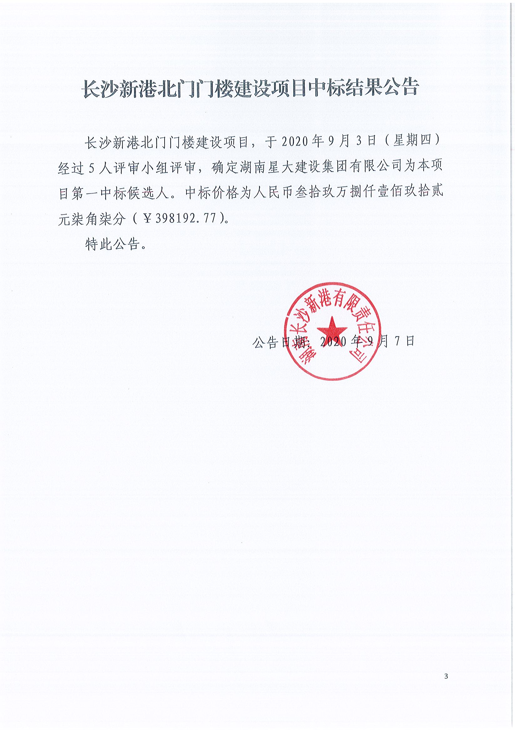 長(zhǎng)沙新港北門(mén)門(mén)樓建設(shè)項(xiàng)目中標(biāo)結(jié)果公告